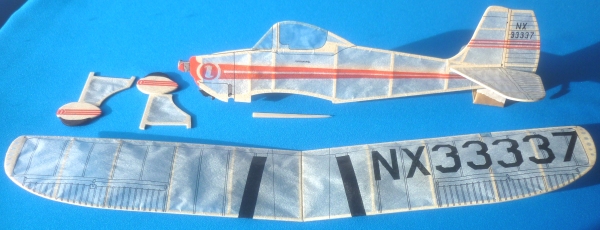 h) Align the tissue with the root rib center line aligned with a straight side of the ironing board like this . . .i) Iron the tissue flat again. j) Turn the wing structure upside down and line the wing leading edge up with the leading edge alignment marks on the tissue, press the leading edge into place, and then gently roll the wing onto the tissue, pushing down lightly on the inside of the ribs as you roll it. k) Turn the structure over, and gently press the tissue down on the leading and trailing edges to assure a good bond. Run the wingtip between a finger and thumb to do the same. Do likewise with the root rib and each wing rib, and then set it aside to dry. l) When dry, trim the excess tissue with a razor blade, and you're done! Here's a shot of all the covered parts ready for assembly . . . ![]() Next up: Assembling the parts. |