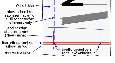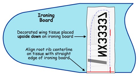 1) Apply adhesive to the structure.When I first started building No-Cals, I used butyrate dope and thinner for an adhesive. Then a newsletter suggested using a glue-stick, which I tried once. I immediately switched to a glue pen, the liquid from the pen being much easier to spread than the sticky glue from a glue stick. Then I learned the trick of using spray adhesive, and I have been using it ever since. Here's how I do it: 1) Spread newspaper out on the floor (use LOTS of newspaper - you don't want adhesive overspray on your floor). 2) Lay the piece of structure on the newspaper. If it is a particularly light-weight piece of structure, use a very small piece of adhesive tape to hold it in place. 3) Shake the can of adhesive well, and spray a LIGHT even coat of adhesive on the structure. 4) Move the piece of structure onto a clean piece of paper on the ironing board, close to where you do the ironing. 5) Turn the piece of decorated tissue upside down and iron flat. Note the location of any alignment marks on the tissue, and using those alignment marks, 6) Press the structure onto the upside-down piece of tissue. Your structure is now covered. At this point, I move the structure to a harder flat surface and press again to make sure the tissue is adhered to all parts of the structure. BUT! You say . . . What about the wing? It's not flat! I can't press it down flat! True enough. Not only is it not flat (the dihedral has already been set), but it also has a curved upper surface, which makes things even more interesting. Here's how I handle it.