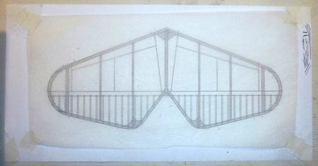 Using the stabilizer as an example, iron the stab tissue flat again, and using small pieces of tape, tape the ironed-flat piece of tissue over the plan drawing so the markings and panel lines can be traced onto the tissue. The silver paint will be so thin, you'll be able to see right through it to trace the markings.At this point, you will quickly discover just how effective the iron is at shrinking the tissue. If you tape the tissue down directly after ironing it, within less than a minute or two, the tissue will be loose. That is because the tissue has absorbed enough moisture right out of the air to expand. Ignore this looseness as best you can, being carefull not to tear the tissue as you apply the markings. The looseness will make the markings less precise, but when it is applied to the structure, nobody will ever notice. 8) Time to apply the markings. I use straight edges and drafting triangles to keep the lines straight. Here I've shown the markings applied to the stabilizer tissue. To allow for some placement error, always extend any line that goes to the edge of the structure well past the edge of the structure so that when the tissue is trimmed, the marking line won't stop before it reaches the edge of the structure.
