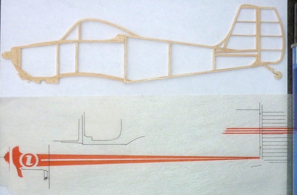 Don't Forget to add alignment reference markings so that the tissue can be properly aligned with the structure when covering!In this picture, I've circled the alignment marks in red. They represent the front of the leading edge of the stabilizer. I also add a centerline in the middle of the stabilizer (it will be hidden by the fuselage structure after assembly). I usually color in solid markings on a model after I've covered the parts, but the red trim lines on the fuselage would be much easier to apply and fill in before covering the structure. After spraying the tissue, I pulled the Tamiya Yellow (masking) tape off, ironed the tissue again, and taped it down onto the drafting board so I could get the red trim lines as straight as possible. Using a straight edge and a red fine-tip felt pen, the red trim was carefully applied. Here's the result . . . ![]() Panel lines and control surfaces were added to the rest of the pieces of tissue in the same manner as the stabilizer and fuselage - iron the silver-painted tissue, tape it over the plan, and trace the panel lines and markings onto the tissue, including the 'N' numbers on the wing and tail, and the tiny 'EXPERIMENTAL' on the fuselage under the canopy (not yet added when this picture was taken). Next up: Covering the structure. |