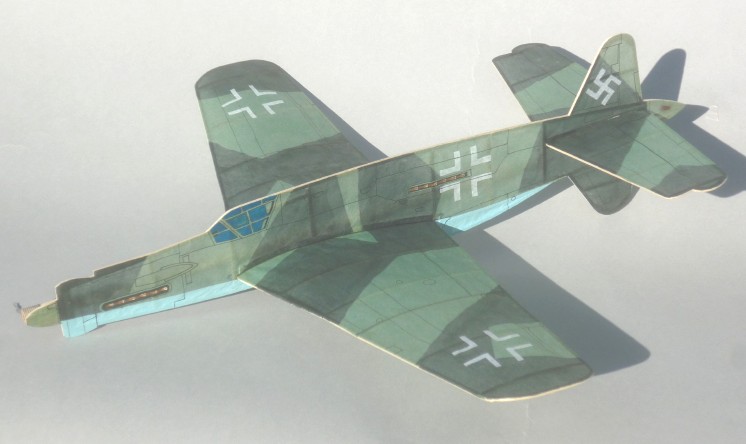 The dark green of the splinter camoflage is achieved by using a PRISMACOLOR #PM-115 COOL GREY 80% felt tip marker, which worked very nicely. Using this color grey on the green tissue makes almost the perfect dark green. The top of the fuselage was then masked off and the bottom spayed light blue, after which the panel lines on the blue were re-inked. The exhaust stacks and canopy were painted using model paint. Alternatively, the canopy could be colored in using a dark felt-tip pen.