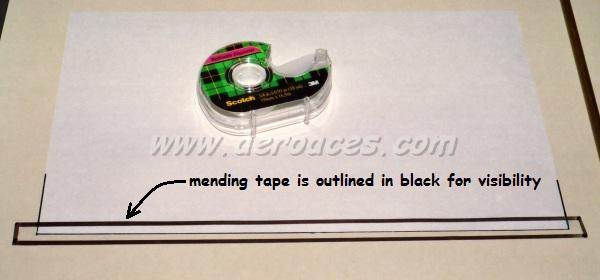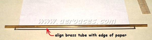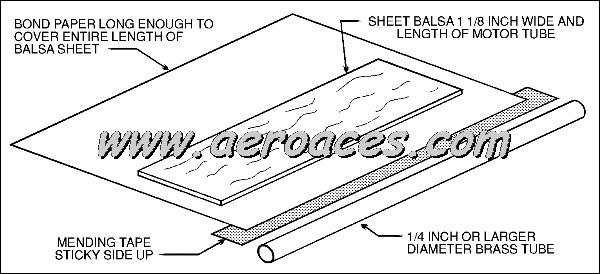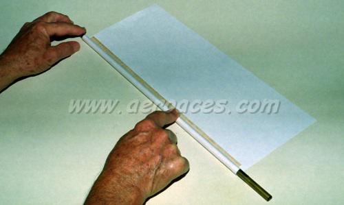 Step 3: Take a piece of mending tape longer than the piece of paper you'll be rolling the tube up in, and tape one long side down to the surface so that half the tape is stuck to the paper, and half the tape is stuck on the work surface. I've outlined the mending tape and the edge of the paper with a black pen so you can see the position of the tape on the paper's edge ... ![]() Step 4: Peel the tape and paper off your work surface and turn it upside down so that the tape is now sticky side up . . . ![]() Step 5: Align the brass tube form with the edge of the paper ![]() Here's another graphic to help show the idea . . . ![]() I use a 1/4 inch diameter brass tube available from the K&S rack at your local hobby, hardware, or art store to roll roll most of my motor tubes. Larger models will require a larger tube. Step 6: With the brass tube aligned, carefully roll it back over the tape to adhere the tape to the tube, then roll it forward . . . ![]() ... until no tape is showing. Step 7: Wipe the excess water off your piece of motor tube wood and carefully place it on the paper parallel to the motor tube ... ![]() ... and roll the wood up into the paper ... ![]() More to come ... |