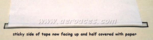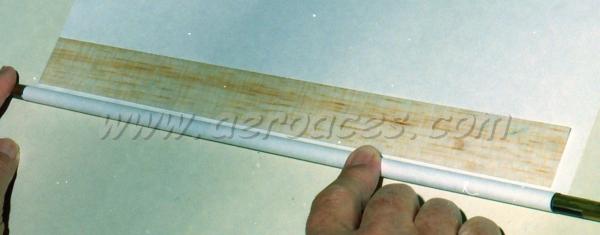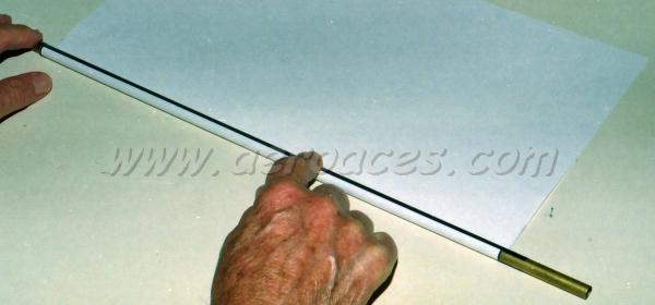 Step 3: Take a piece of mending tape longer than the piece of paper you'll be rolling the tube up in, and tape one long side down to the surface so that half the tape is stuck to the paper, and half the tape is stuck on the work surface. I've outlined the mending tape and the edge of the paper with a black pen so you can see the position of the tape on the paper's edge ... ![]() Step 4: Peel the tape and paper off your work surface and turn it upside down so that the tape is now sticky side up . . . ![]() Step 5: Align the brass tube form with the edge of the paper ![]() Here's another graphic to help show the idea . . . ![]() I use a 1/4 inch diameter brass tube available from the K&S rack at your local hobby, hardware, or art store to roll roll most of my motor tubes. Larger models will require a larger tube. Step 6: With the brass tube aligned, carefully roll it back over the tape to adhere the tape to the tube, then roll it forward . . . ![]() ... until no tape is showing. Step 7: Wipe the excess water off your piece of motor tube wood and carefully place it on the paper parallel to the motor tube ... ![]() ... and roll the wood up into the paper ... ![]() More to come ... |